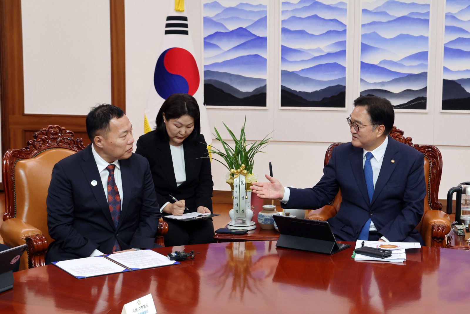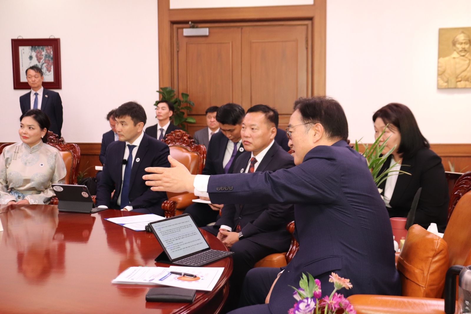БНСУ-ын Үндэсний Ассамблейн дарга Ү Вон Шиг уулзалтын эхэнд, Ардчилсан намын дарга О.Цогтгэрэл тэргүүтэй төлөөлөгчдийг тус улсад зочилж байгаад талархал илэрхийлэхийн зэрэгцээ хоёр орны хооронд дипломат харилцаа тогтоосны 35 жилийн ой тохиож буйг онцлон дурдав. Мөн цаашид хоёр орны “Стратегийн түншлэл”-ийн харилцааг улам гүнзгийрэн бэхжих байх гэдэгт итгэлтэй байгаагаа илэрхийлэв. Түүнчлэн энэ оны дөрөвдүгээр сард Монгол Улсад айлчилсан нь хоёр орны харилцааг улам бэхжүүлэх үйл явдал болсныг онцлон дурдаад Монгол Улсад зочлох үед Монголын ард түмнээс хүлэг морь бэлэглэсэнд билэгшээж, уг мориндоо “Хашаа давагч” хэмээн нэр өгсөн гэдгээ сонирхуулан дурдав. Мориндоо ийм нэр өгсөн тухайгаа ярихдаа тэрээр, өнгөрсөн оны 12 дугаар сард БНСУ-д онц байдал зарлах үед Үндэсний Ассамблейн дарга Ү Вон Шиг парламентын ордны хашаа давж орон Үндэсний ассамблейг хуралдуулж онц байдлыг цуцлах шийдвэр гаргаж байсан түүхээ бэлгэдэн өгчээ. Үндэсний Ассамблейн дарга Монголын 10 аймагт хэрэгжиж байгаа дулааны станцын төслийг үргэлжлүүлэн хэрэгжүүлж дуусгахын төлөө хүчин чармайлт гаргаж байгаагаа мөн илэрхийлэв. Ардчилсан намын дарга, УИХ дахь АН-ын бүлгийн дарга О.Цогтгэрэл Үндэсний Ассамблейн дарга Ү Вон Шиг Монголын төлөөлөгчид биднийг найрсгаар хүлээн авч байгаад талархал илэрхийлэхийн ялдамд парламентын хамтын ажиллагааг гүнзгийрүүлж хоёр орны хооронд нийгэм, эдийн засгийн бүхий л салбарт харилцаа өргөжиж байгаад сэтгэл хангалуун буйгаа илэрхийллээ.